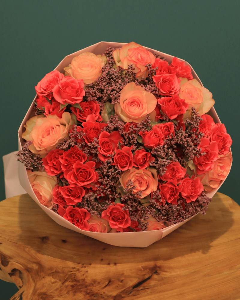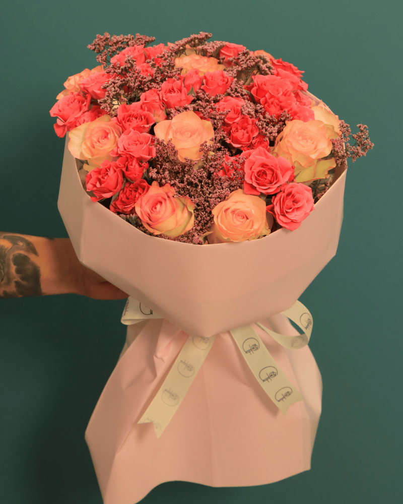 بوكيه “لمسة وردية” يجمع بين الزهور الطبيعية بدرجات الوردي الفاتح والمشمشي ولمسات من الزهور الجافة البنفسجية ليمنحك مزيجًا من الرقة والفخامة. تصميم مثالي يعبر عن الذوق الراقي والمشاعر الجميلة، مناسب للهدايا والمناسبات الخاصة.