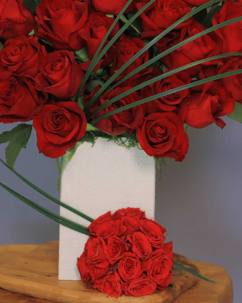قطعة فنية تنطق بالحب والجمال، تنسيق فاخر من الورد الأحمر الطبيعي في فازة أنيقة تضيف لمسة راقية لأي مناسبة. مثالية كهدية تعبّر عن المشاعر بصدق، أو كإضافة فخمة لحفلات ومناسبات استثنائية.