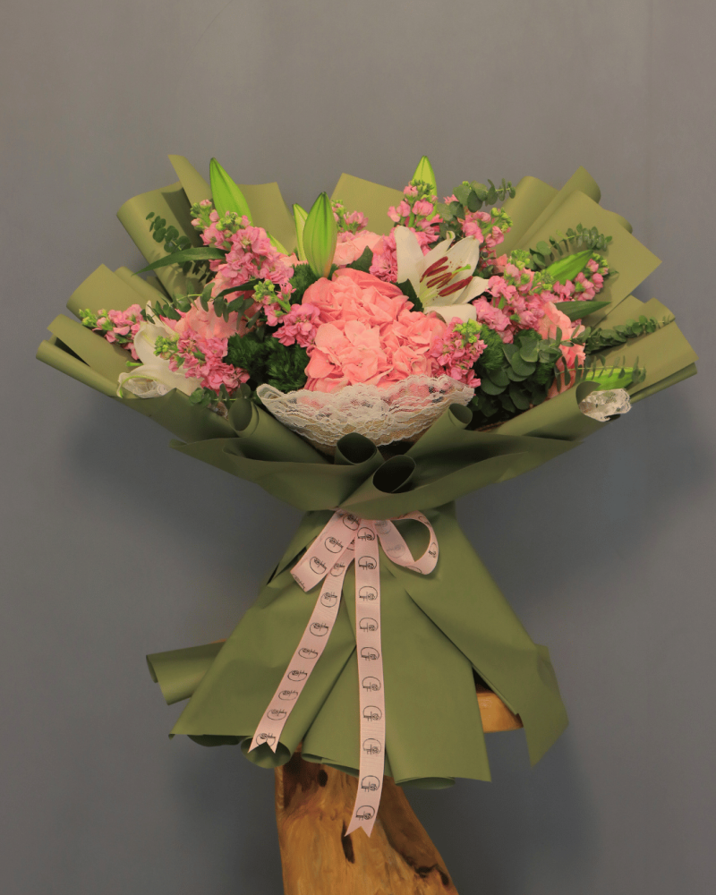 بوكيه أنيق ينبض بالحيوية، يجمع بين الهدرنجا الوردي الناعم وزهور الليلي الفاخرة مع لمسات من الزهور الموسمية باللون الوردي وتغليف انيق . تنسيق مثالي يعبّر عن البهجة ويضفي لمسة من الجمال على كل مناسبة.
