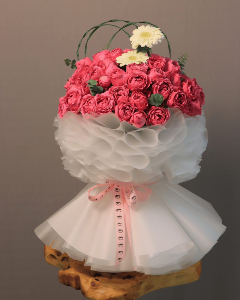 بوكيه أملي يدمج بين جمال الورد الجوري الوردي ولمسة من الزهور البيضاء الناعمة، بتغليف فاخر باللون الأبيض مع شريط وردي أنيق. خيار مثالي للتعبير عن المشاعر الرقيقة، والاحتفال بالمناسبات الخاصة بطريقة راقية.