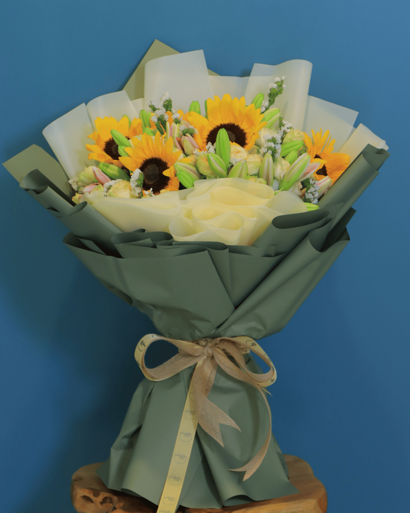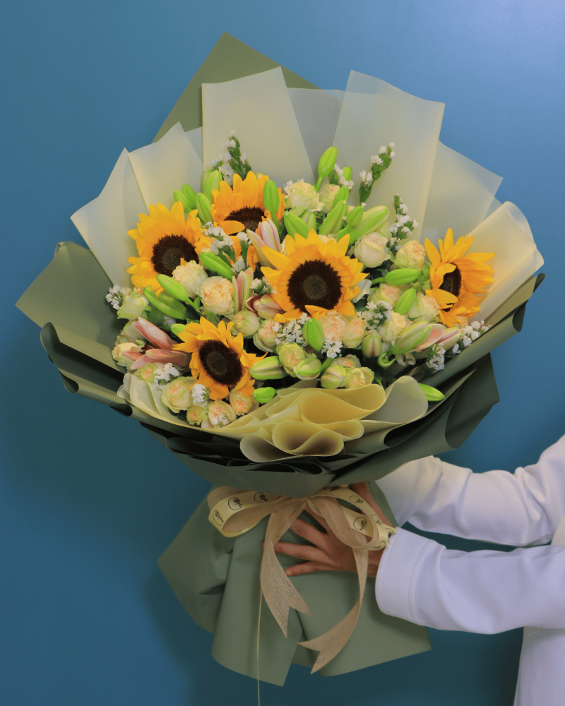 بوكيه فاخر يحمل في تفاصيله أناقة متجددة وروح مشرقة، يجمع بين جمال الزهور الموسمية وسحر دوار الشمس ليكون هدية تنبض بالحيوية وتترك أثرًا لا يُنسى.