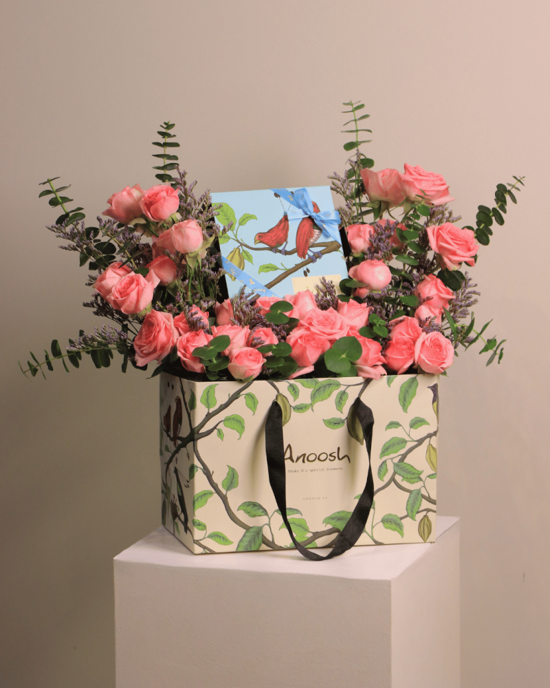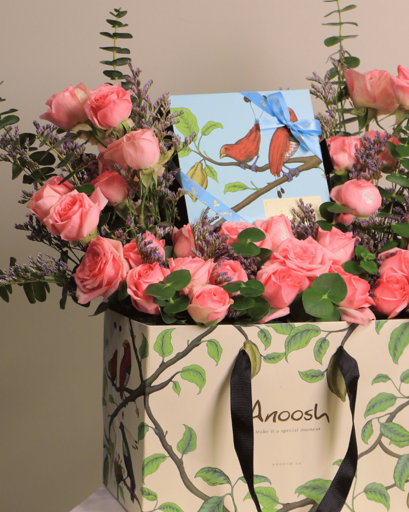 هدية متكاملة تجمع بين رونق الورود الطبيعية الفاخرة مع شوكلت أنوش الشهير بجودته العالية وطعمه الفاخر، لتكون خيارًا مثاليًا للتعبير عن مشاعرك بأناقة ورقي. مناسبة للمناسبات الخاصة وترك أثر جميل لا يُنسى.
