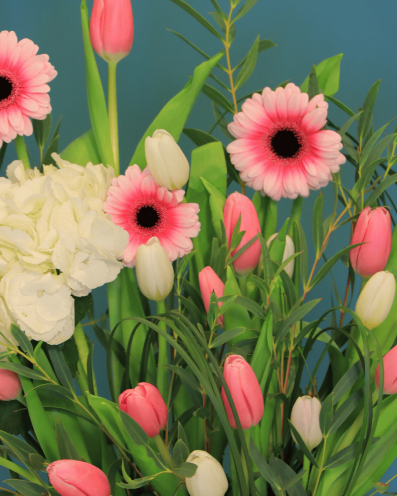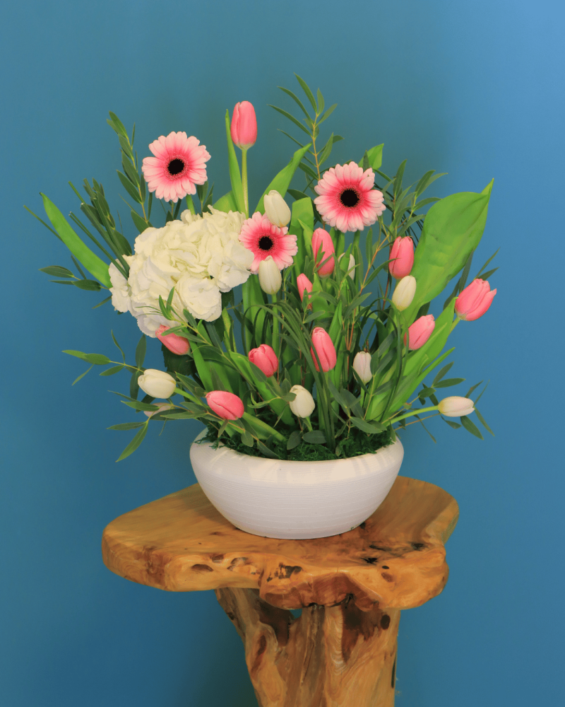 تنسيق أنيق يجمع بين روعة التوليب وأناقة الهدرنجا وجمال الجربيرا، مع لمسات خضراء تمنح الفازة مظهراً طبيعياً ومنعشاً. فازة مثالية تضيف لمسة راقية لأي مكان وتعبّر عن الذوق الرفيع والبهجة في كل تفاصيلها.