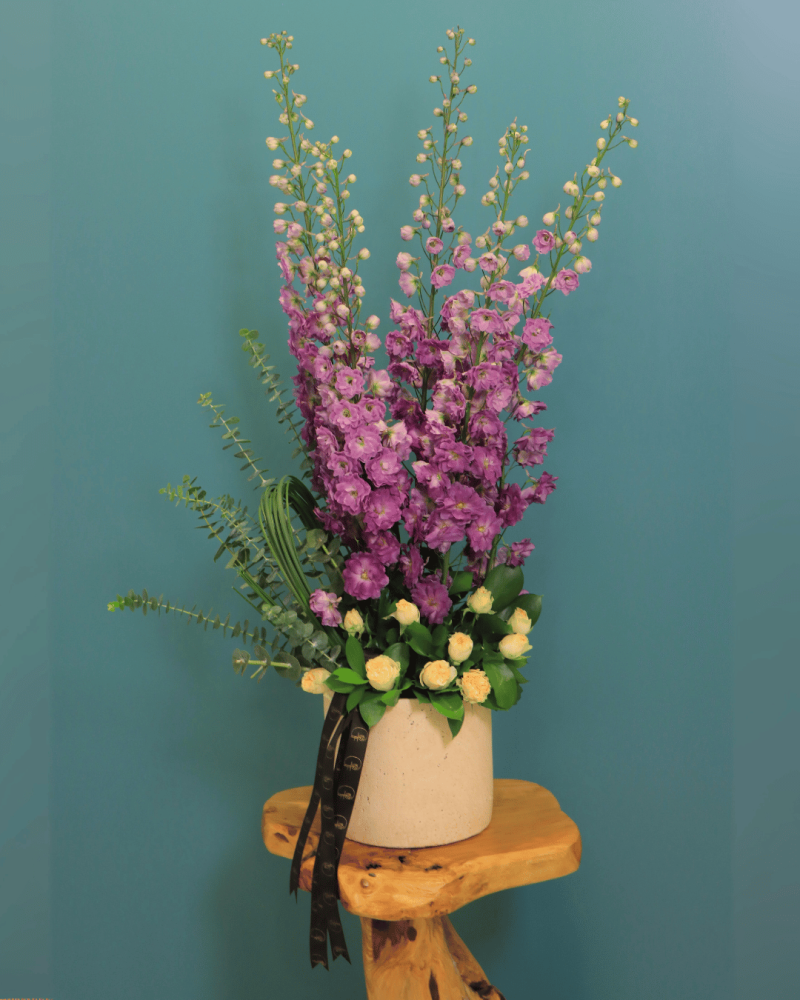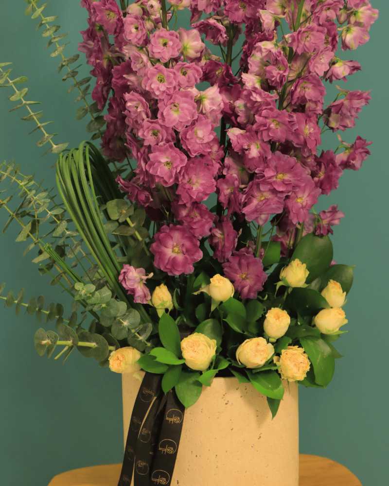 تنسيق فاخر يجمع بين الأزهار البنفسجية الطويلة مع ورود كريمية ناعمة داخل فازة أنيقة. لمسة فنية تضيف فخامة لأي مكان وتعبّر عن الذوق الرفيع.