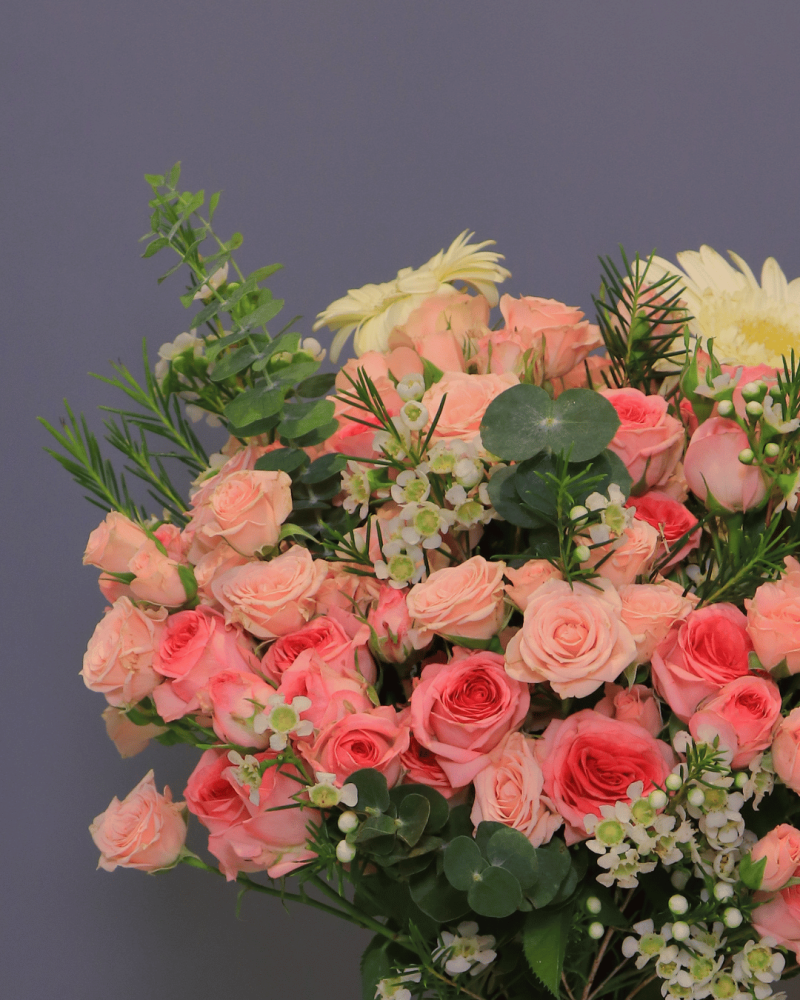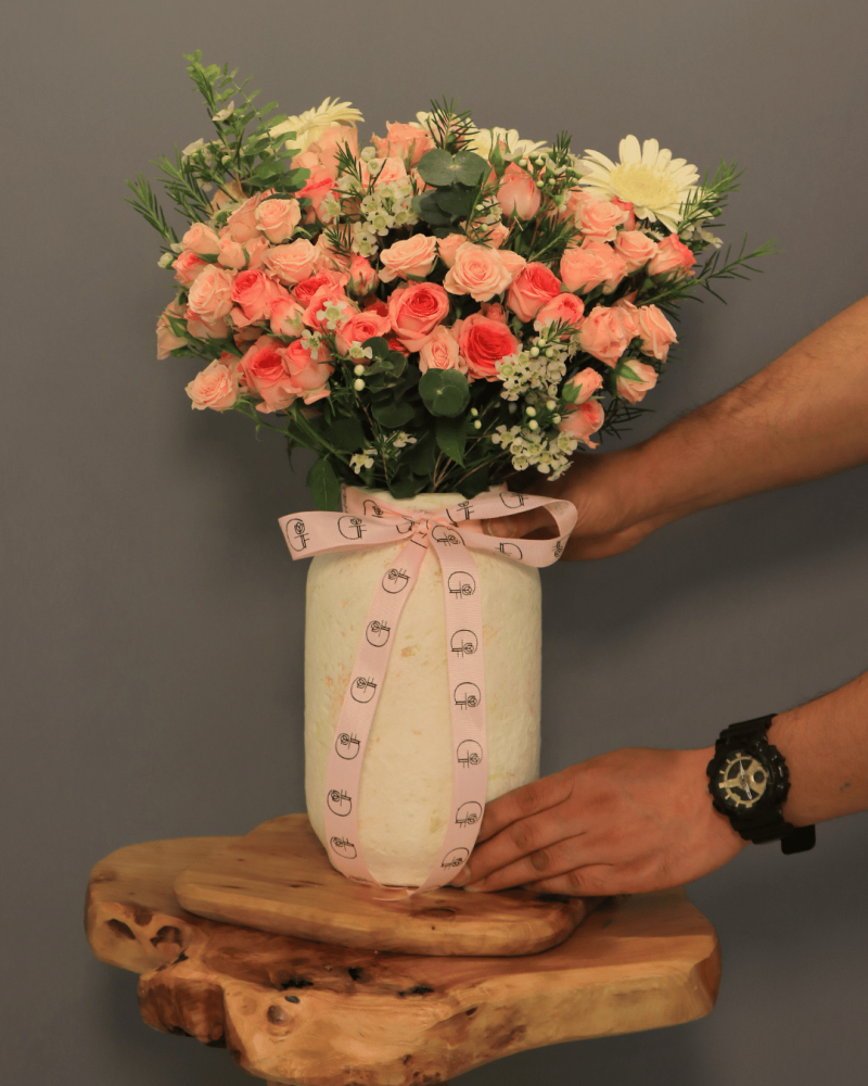 فازة أنيقة تحمل تنسيقًا متناغمًا من بيبي جوري وردي وزهور الجربيرا المبهجة. تصميم فاخر يضفي أجواء من النقاء والجمال على أي مكان تُوضع فيه، ليكون هدية مثالية تعبّر عن الحب والرقي.