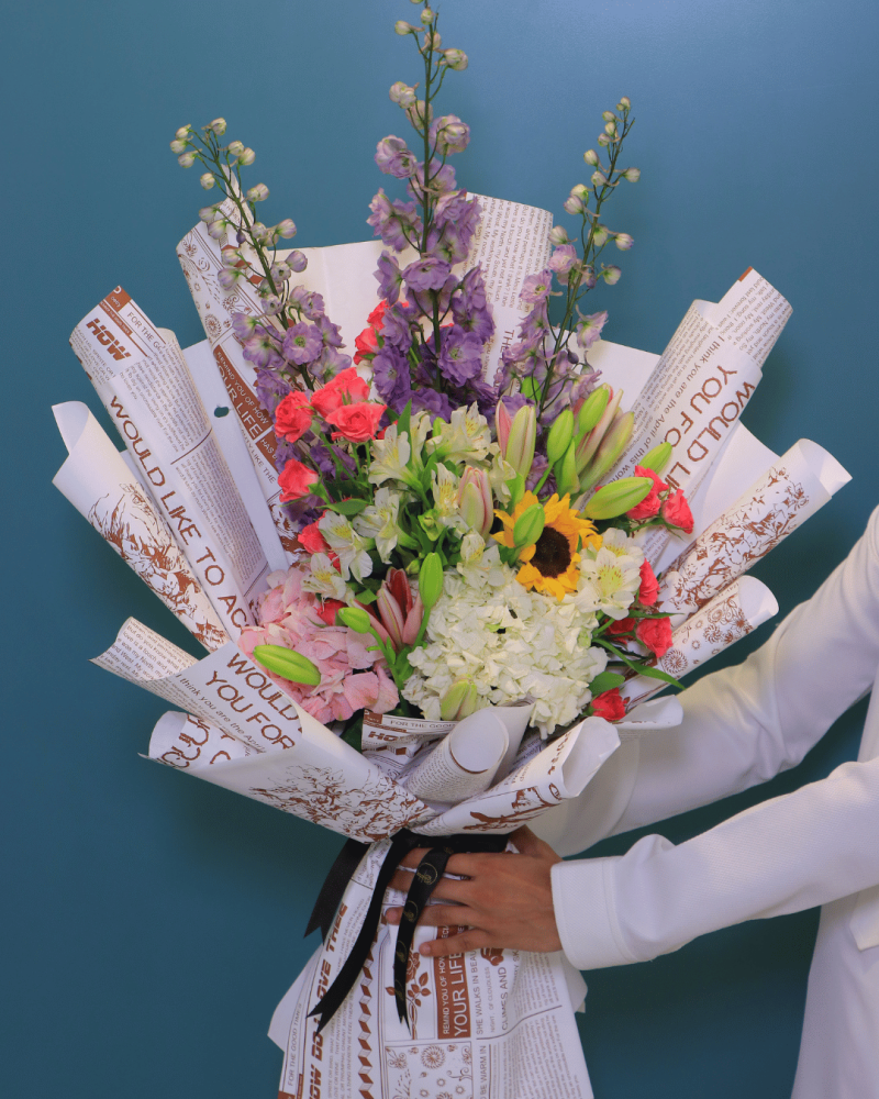 بوكيه أنيق يجمع تناغم الألوان وسحر الطبيعة في تنسيق واحد، صُمم ليكون رمزًا للفرح والحب. لمسة مثالية للتعبير عن مشاعرك في كل مناسبة بأسلوب راقٍ وجذاب.
