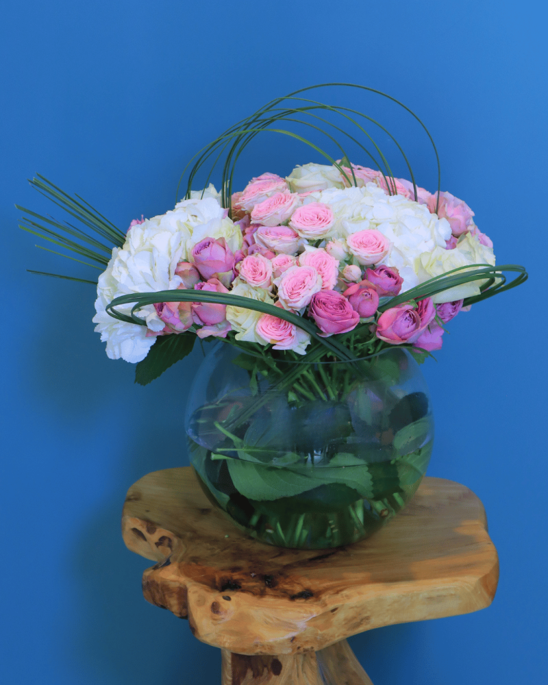 فازة زجاجية أنيقة بتصميم فاخر يضم ورد أبيض ناعم مع بيبي جوري وردي بتنسيق ساحر يضفي لمسة من الرقي والرومانسية. مثالية كهدية راقية أو كقطعة ديكور تضيف الجمال والبهجة لأي مكان.