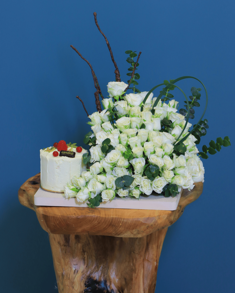تجربة فاخرة تجمع بين جمال الورد الطبيعي ولمسات التنسيق الأنيق مع كيك دائرية لذيذة، تُقدَّم على استاند أنيق لتكون هدية متكاملة تنبض بالحب والرقي.