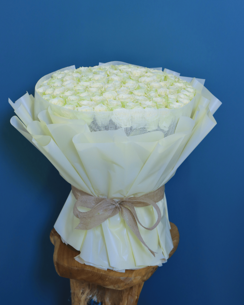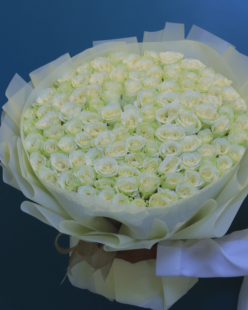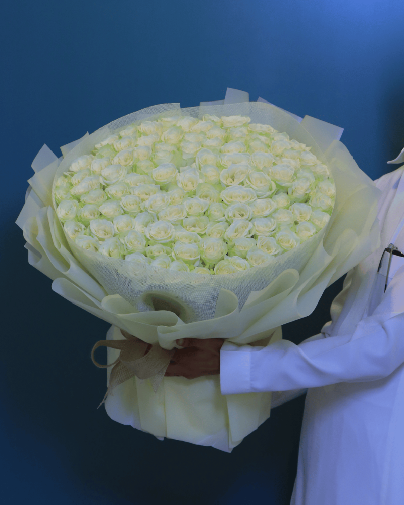 بوكيه فاخر يضم 100 وردة جوري طبيعية بتنسيق أنيق يعكس أرقى معاني الحب والرومانسية. تصميم مثالي للمناسبات المميزة وللتعبير عن المشاعر الكبيرة بأسلوب فخم ولا يُنسى.