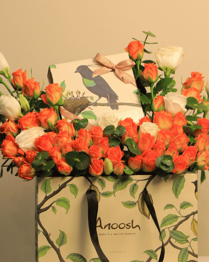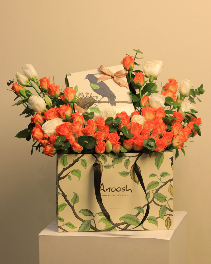 تنسيق فاخر يجمع بين روعة الورد الطبيعي وسحر الطعم مع شوكولاتة أنوش المميزة. البوكيه يحتوي على ورود بيبي جوري برتقالية منسقة بأناقة مع لمسات خضراء، يرافقها علبة شوكولاتة أنوش لتكون هدية مثالية تعبّر عن الذوق الراقي والاهتمام.